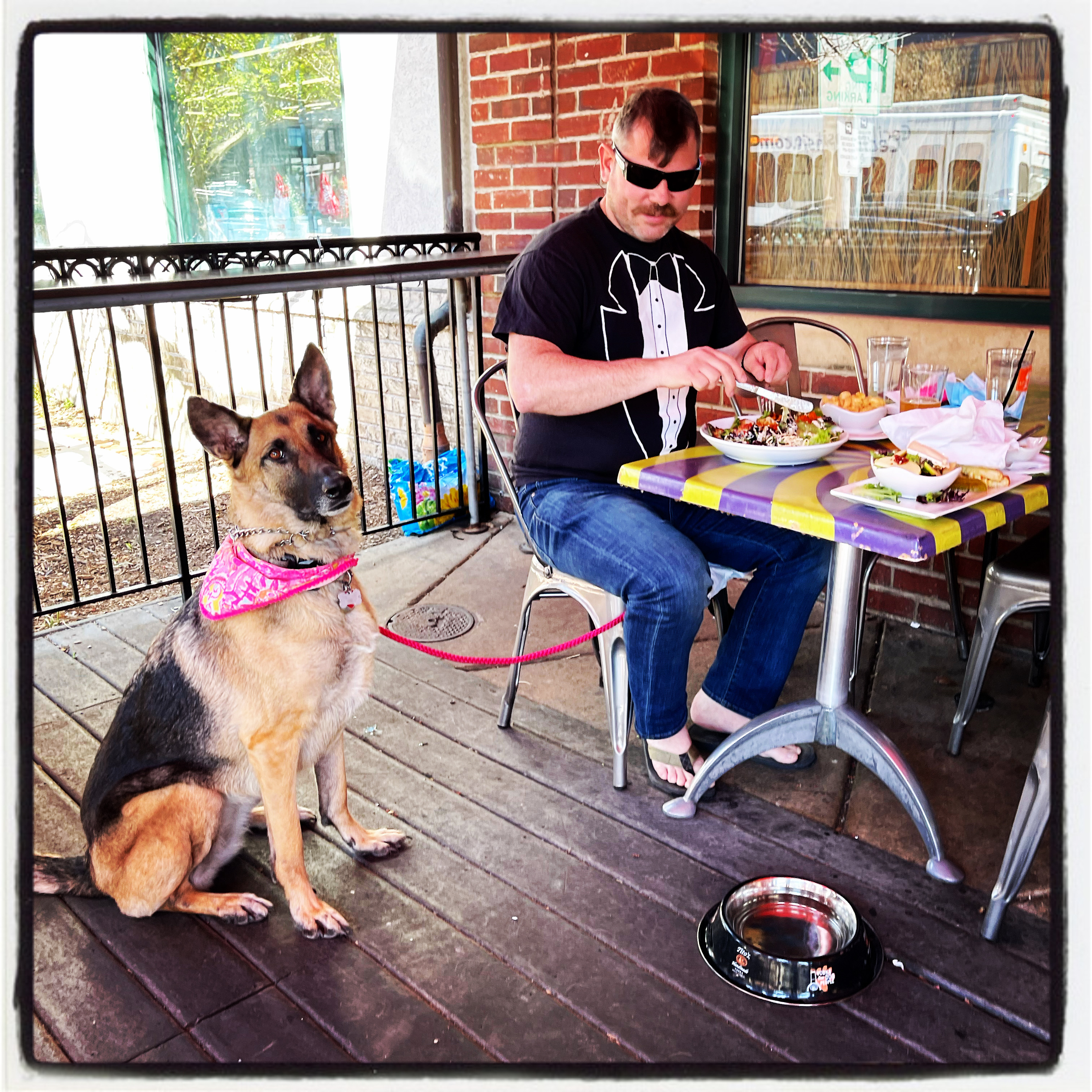 Do not enter the inside of the restaurant with your pet. Please pop your head inside to let the host know you would like to sit outside with your pet then wait outside.